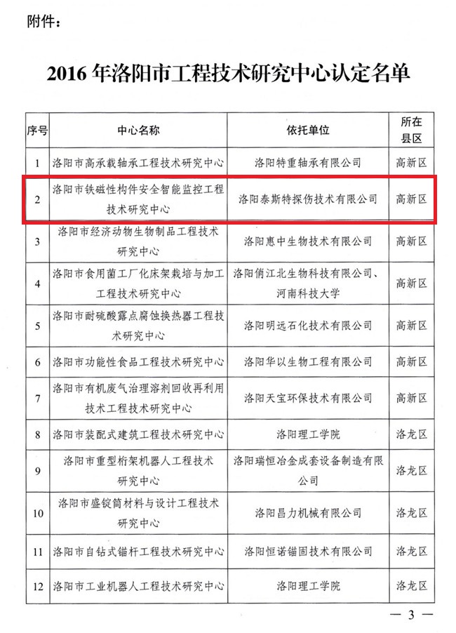 根據(jù)《洛陽市工程技術(shù)研究中心管理辦法》(洛市科【2006】95號(hào))規(guī)定,經(jīng)組織申報(bào)、初審、現(xiàn)場考察、會(huì)議評(píng)審等評(píng)審程序,洛陽泰斯探傷技術(shù)有限公司被認(rèn)定為洛陽市鐵磁性構(gòu)件安智能監(jiān)控工程技術(shù)研究中心。